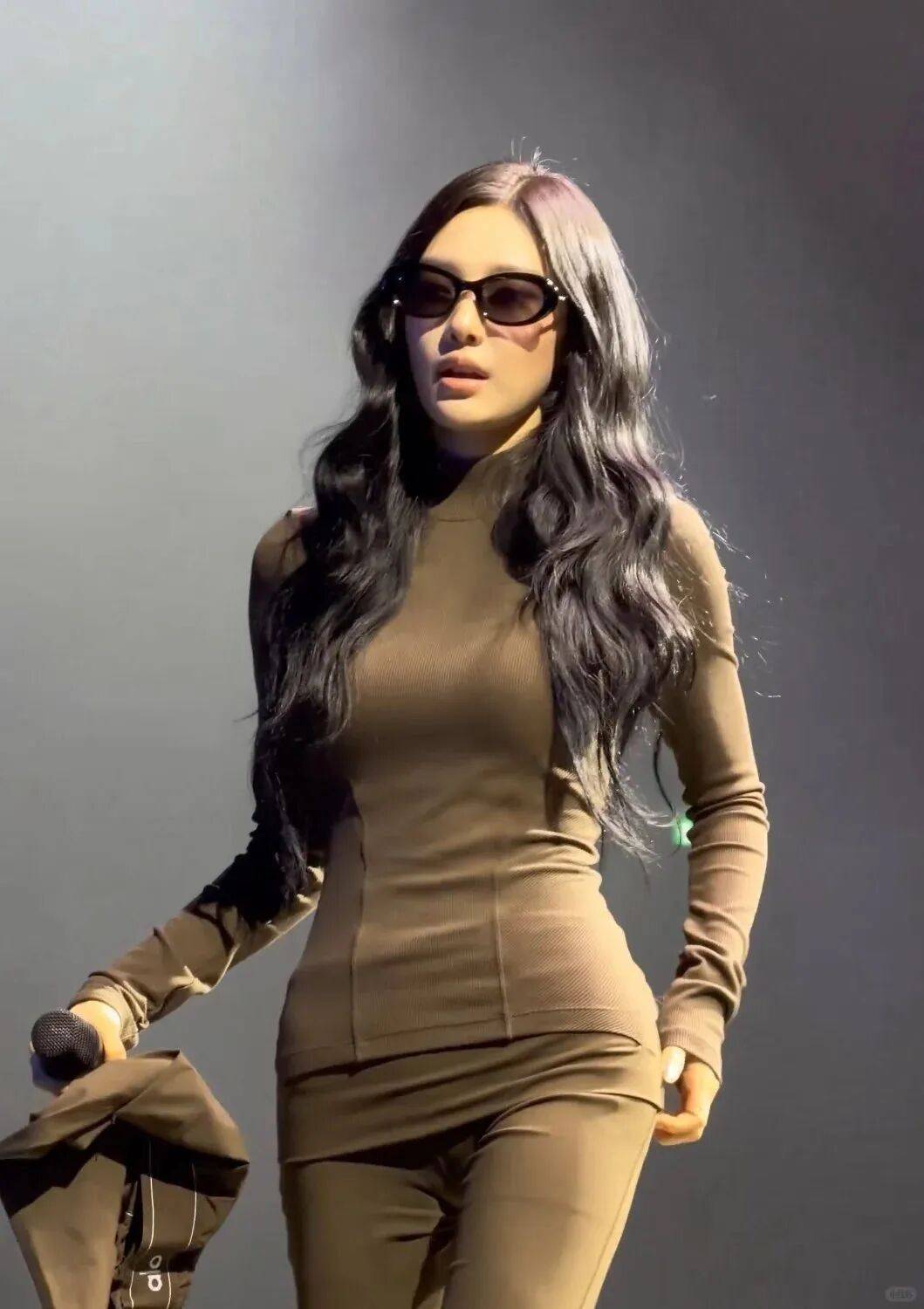 另一套咖色紧身套装也是完美体现出她的身材优势。