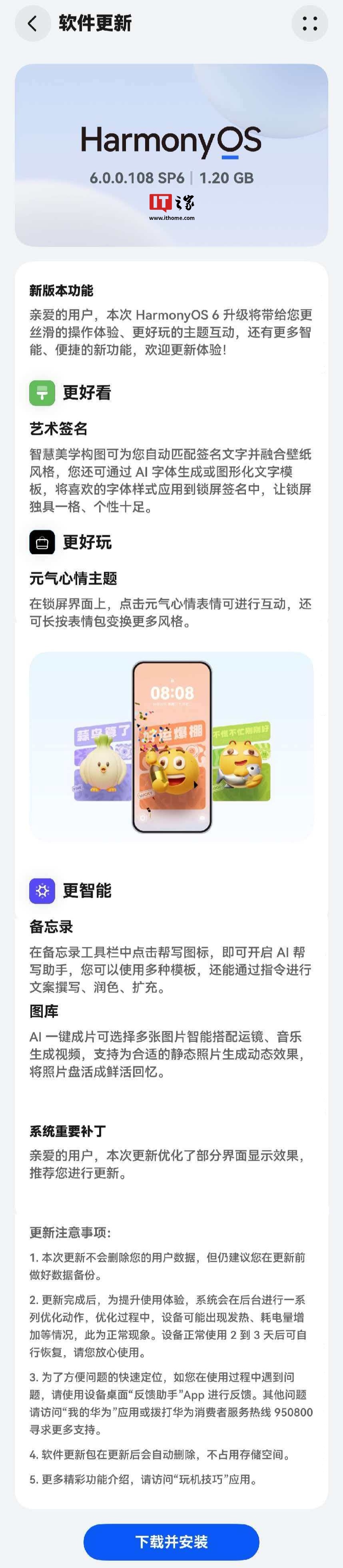 目前,鸿蒙 HarmonyOS 6.0.0.108 SP6 版本已开启推送,系统包大小约 1.20GB。本次 HarmonyOS 6 升级将带来更丝滑的操作体验、更好玩的主题互动,还有更多智能、便捷的新功能。
